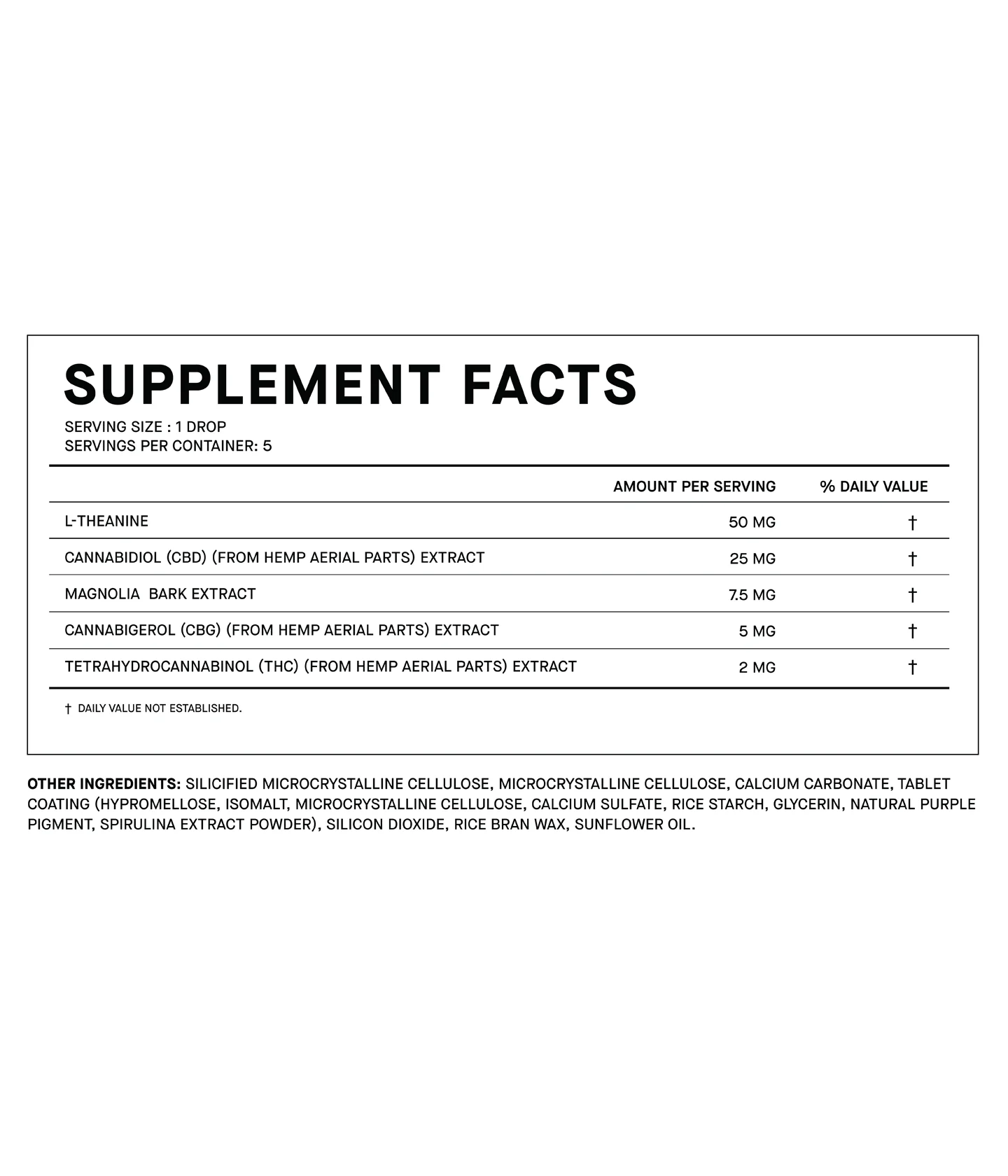 Relaxation that’s functional, not fuzzy. Chill Drops are infused with two plant medicines and three cannabinoids, including CBG, for anytime, anywhere anxiety relief. We blend a high dose of CBD to ease tension with microdosed THC to soften any edges and CBG to deepen relaxation while keeping you calm, clear, and present — no heaviness or couchlock. Together with Magnolia and L-theanine, Chill feels like a deep sigh for your brain and body in 20 minutes or less.